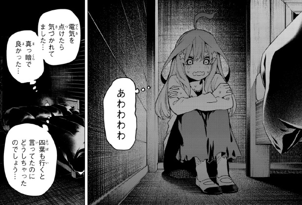 「あわわわわ」四葉が確認に行くからと言ったので、五月も風太郎の所に行ったようです。