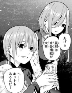 そしてキャンプファイヤーですが、結局体調不良で風太郎は誰とも踊れませんでした。が、五月が手を握った形でカントダウンが始まりました。このままいけば手を結んでいたペアは結ばれるので、五月と風太郎が結ばれるのですがそれは無いか?