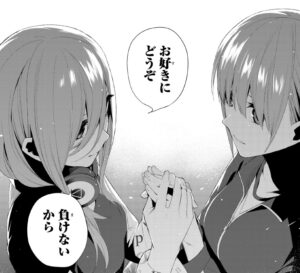 これは三玖の宣言ですね。お好きにどうぞですから、一花はどう反応するでしょうか?