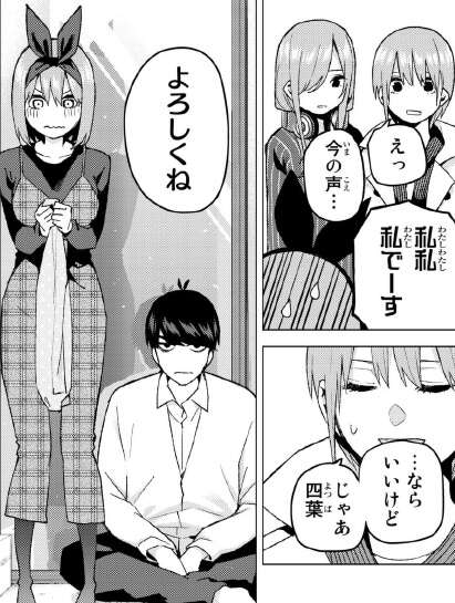 前回からの四葉とのデート回、終了ですが目をつむっていたとはいえ、風太郎の前で着替えるとは四葉も意外と大胆です。公園でも風太郎といい感じになっていました。四葉の個別回は貴重なので、すごく楽しめました。