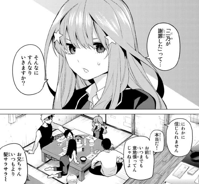 悪いと思っていると素直に謝る二乃です。風太郎はこの調子で五月にも謝り、仲直りしようと言いますが叩かれた事をまだ根に持っています。五月が変わってしまい、知らない子になってしまったようだとショックを受けています。