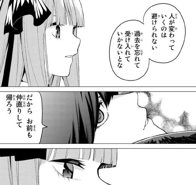 風太郎は零奈の件で、人が変わっていくのは避けられない、過去を忘れても受け入れないといけないと言い、五月と仲直りしてお前の家に帰ろうと言います。風太郎なりに、写真の子との突然の出来事は消化しつつあるようです。