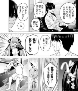 呆れる二乃ですが、風太郎の体の匂いが臭い事に気付きます。風太郎は池に落ちたと事情を説明しますが、匂いに関しては全然に気にしていません。強引にシャワーを浴びさせる二乃です。