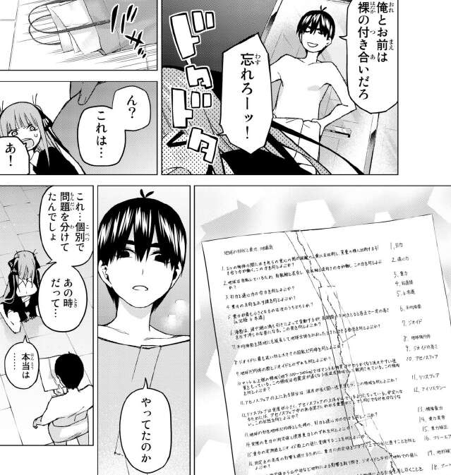 風呂から出た風太郎は、五月と喧嘩した時に二乃が破った風太郎謹製の独自問題集をテープでなおしていました。さらに問題を解いている状態の用紙を偶然見つけます。