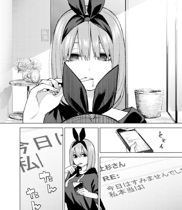 四葉の目が死にかけているように見えてヤバいです。ちゃんとメールで風太郎に謝ろうとする四葉ですが、結局メールを削除します。