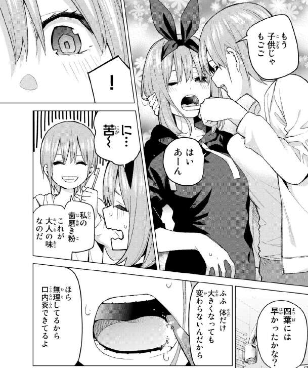 四葉に歯が全然磨けていないと、一花が代わりに歯を磨いてあげます。葉を磨いてあげながら、四葉が無理をしていると指摘する一花お姉さんです。