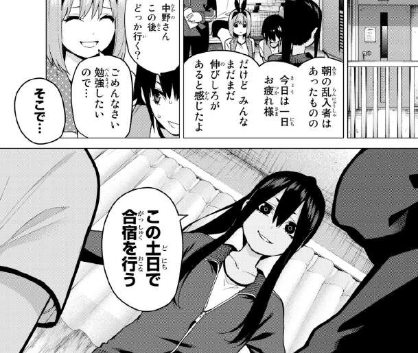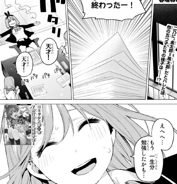 場面変わって、風太郎家です。五月は普通に風太郎の家で熟睡しています。今さら照れても遅い気が。五月も風太郎の問題集を終わらせているようで、残るは二乃のみです。