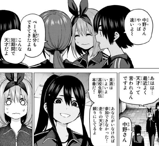 一花は四葉の本音を聞いて陸上部のとこに直接行くと言い、風太郎も当然行くと言います。地味に五月も一緒にいます。