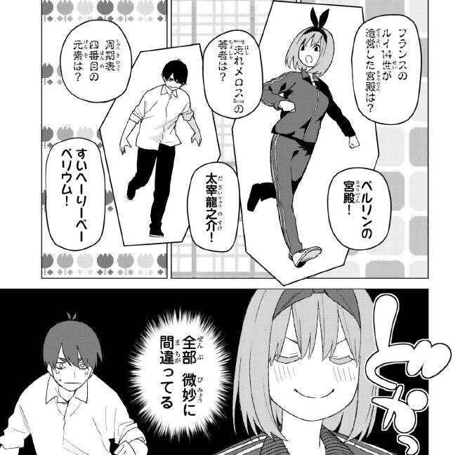 五月も四葉に無理していないかと話しかけますが、四葉自身は問題なしと言いきります。そんな四葉と一緒に陸上部の練習に付き合う風太郎です。が、運動が苦手な風太郎は早くも脱落しそうです。陸上の練習に付き合いながら期末試験対策がどの程度か確認しますが、微妙にすべて間違っています。しかもこれでドヤ顔の四葉です。