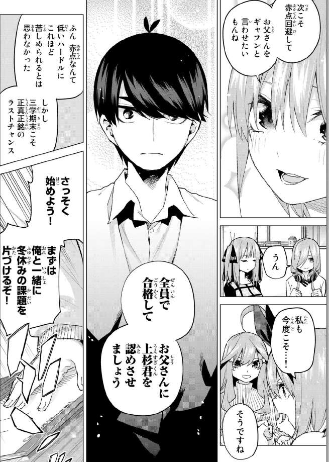 次こそ赤点回避をして、父親に風太郎を認めさせたい五つ子たちです。三学期期末が実質上のラストチャンスになります。風太郎は冬休みの課題を片付けようとしますが、既に五つ子たち全員、課題は終わっています。