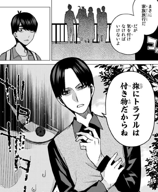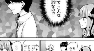 今週から春休みの家族旅行、温泉編が始まりそうですが、目の前で娘の二乃を連れ去られ怒っていた中野パパが再登場です。今回のラストでも風太郎に怒っているようにも見える表情ですが、風太郎は家族旅行を無事楽しめるのでしょうか。そして、二乃の告白の行方は?また、告白現場に偶然いあわせた一花はどうでるでしょうか。