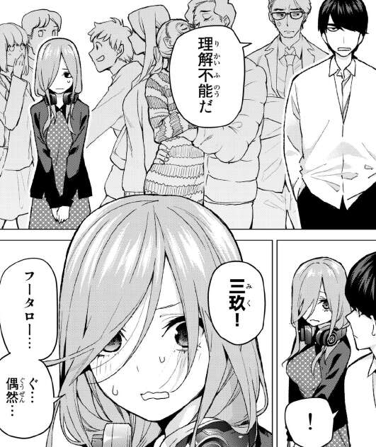 信号待ちをしながら恋人同士の会話にうんざりしていると、何故か三玖と偶然?出会います。