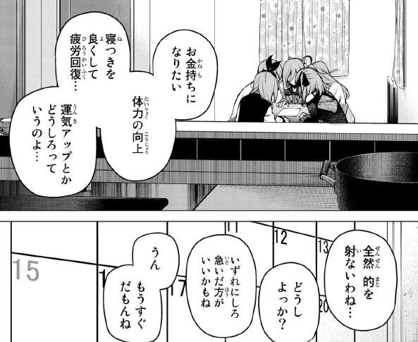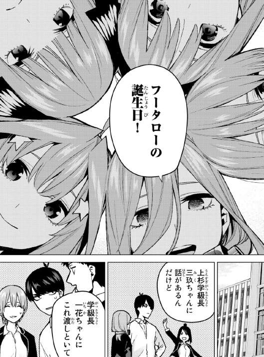 風太郎の誕生日の為の、三玖の質問だったようで風太郎の誕生日に何か企画している、五つ子たちです。一方、風太郎は五つ子の窓口としてすっかり定着して、目の前に本人がいるのに風太郎を通すほどになりました。
