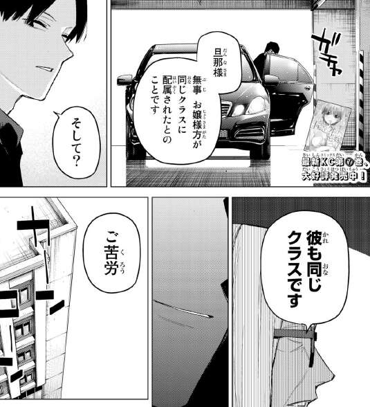 前回、3年になりクラス替えが発生しましたが、風太郎と五つ子全員が同じクラスになりました。その裏で中野父親が、風太郎と五つ子が同じクラスになった報告を受けて何故か意味ありげな笑みを浮かべます(後でわかりますが、中野父親と学校の理事長が知り合いで、中野父親から理事長に同じクラスになるようお願いした、というように推測します)。