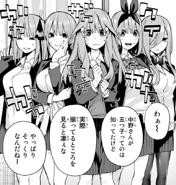 一方、五つ子たちは新しいクラスで質問攻めにあいます。顔がそっくりの五つ子姉妹は珍しいので、全員が注目の的になり全員が若干当惑気味です。