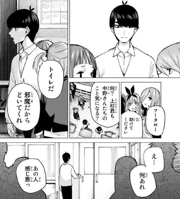 しかし風太郎だけはいつも通りの態度で、五つ子にあからさまに興味がない態度で、クラスメイト達にも感じ悪いです。クラスメイトが悪口を言うと、五つ子たちは二年の時からあんな感じだと風太郎をフォローします。
