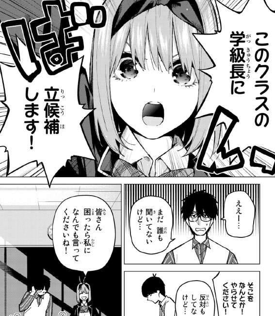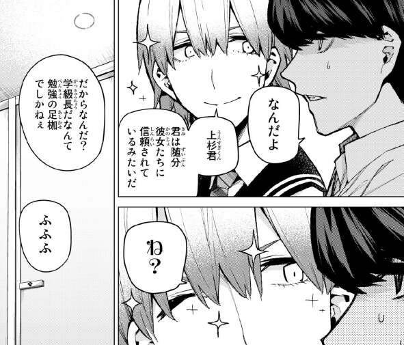 最初は風太郎の不愛想で社交性の無い性格に、クラスメイト全体から誤解されそうでしたが、学級長として、そして五つ子の窓口としてクラスにも溶け込めて、誤解されずにすみました。