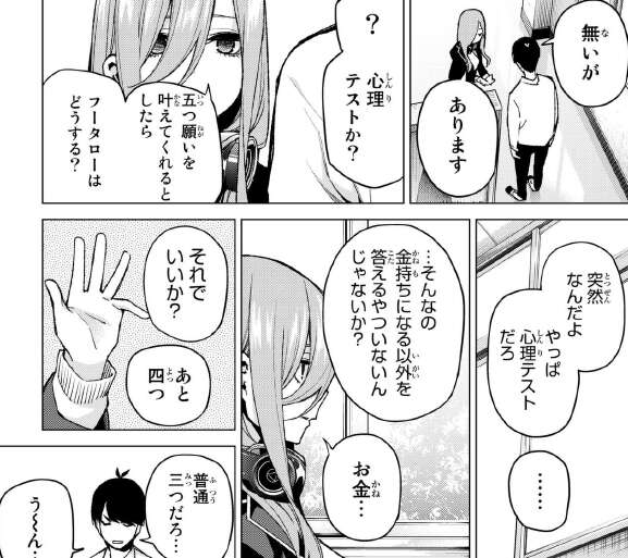 風太郎が男子トイレから出ると、三玖からいきなりここに魔法のランプがあります、と言われます。心理テスト?と聞きますが、三玖は無視して五つ願いを叶えてくれるとしたら、風太郎はどうするかと質問されます。風太郎は、金持ちになる、体力を上げる、疲れが溜まる一方だから疲労回復、寝つきが悪いので寝つきを良くする、運気を上げる、と思いつく願いを列挙していきます。結局、三玖は願いを聞くだけでわかったと言い、それ以上は無言です。