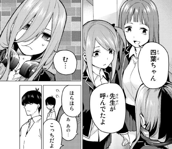 そこにクラスメイトが三玖を四葉と間違えて、先生が呼んでいたと伝えます。うまく訂正できず三玖が困っていると、風太郎がそいつは四葉でなく三女の三玖だと訂正します。