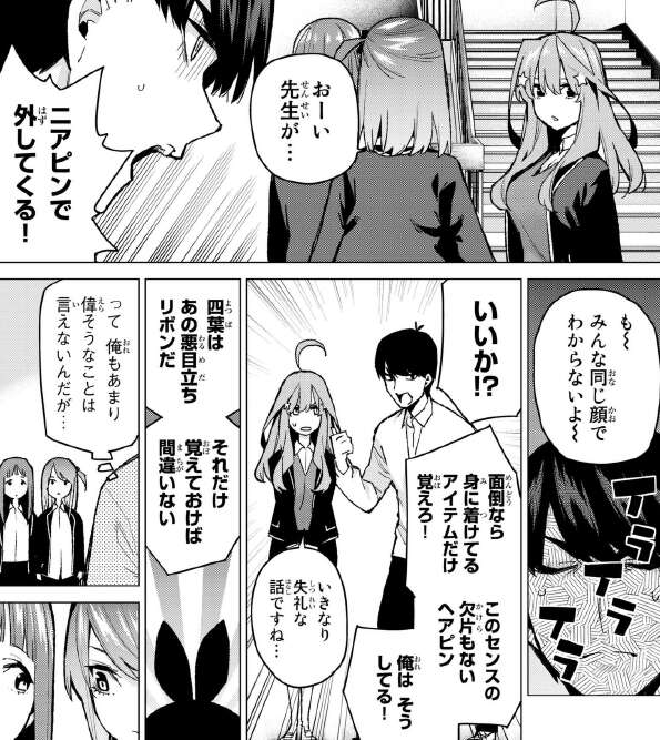 まだ見分けがつかないクラスメイトは三玖に謝った後、今度は五月を四葉だと間違えて五月に呼びかけます。風太郎はイライラして、身に着けているアイテムで覚えろと、センスのない欠片もないヘアピンを五月、悪目立ちリボンを四葉だと言い切ります。