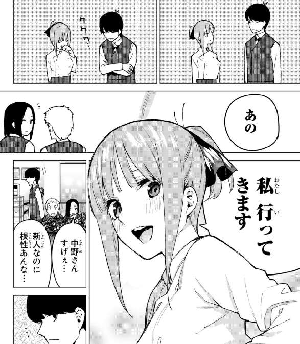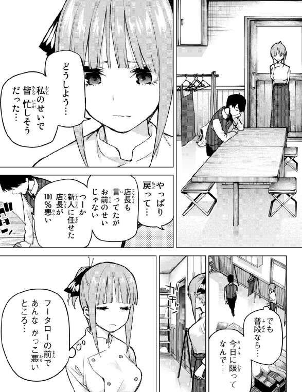 二乃はアルバイト先の一員と認められて、風太郎に少しでも近づこうと頑張りますが、味に違和感があると言われ作り直すことになります。二乃は頑張っていますが、頑張りが空回りしている感じです。