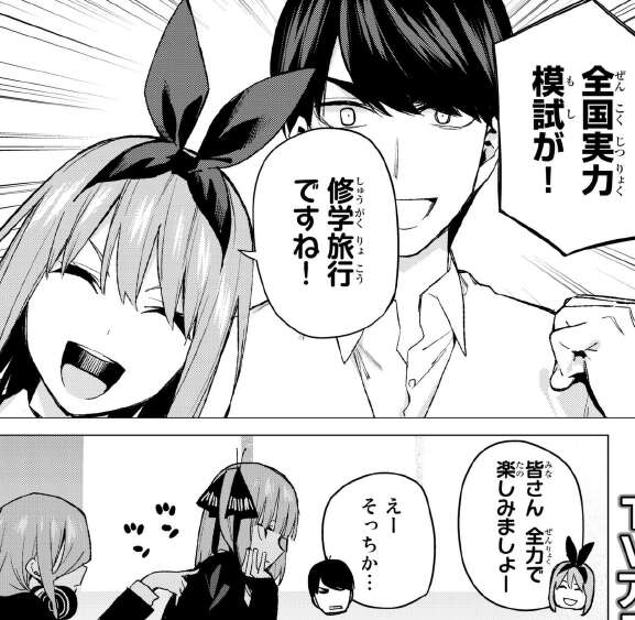 風太郎と四葉が新学期の挨拶をし、一学期のメインのイベントについて話をしようとします。風太郎は一学期のメインイベントといえば全国模試をあげますが、四葉は修学旅行をと言います。