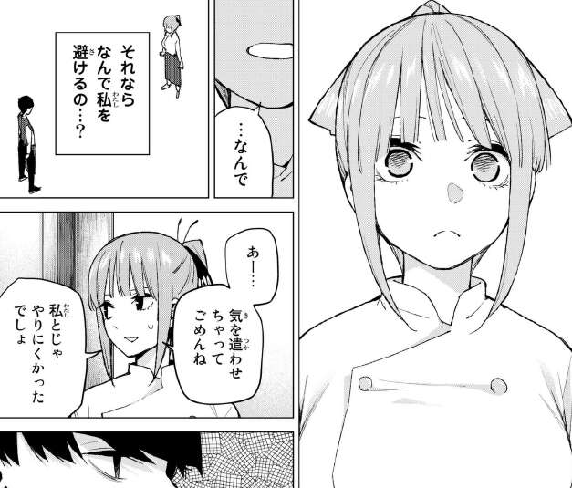 一応、先輩だし、と二乃をフォローしますが、それならなんで私を避けるの?と思います。二乃は風太郎に気を遣わせてごめんねと言いますが、俺は勉強しかできない男だと言います。