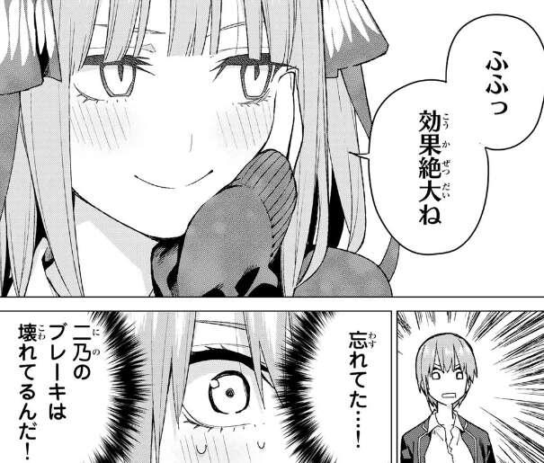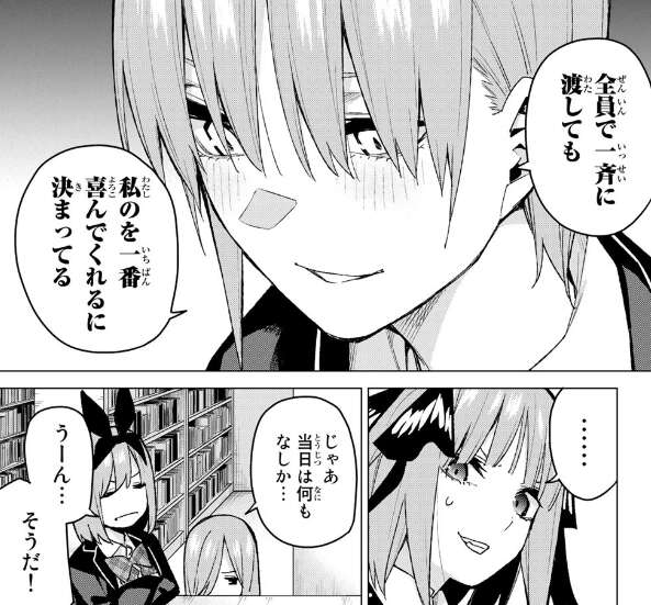 一花は前回、三玖の変装をしてとはいえ風太郎に告白してから、二乃に対しても堂々と風太郎が好きだと言ったり、自分だけ誕生日プレゼントを渡せるように妹たち全員にプレゼント中止とメッセージを送ったり、かなり暴走していますね。二乃が引いているのも、分かる気がします。