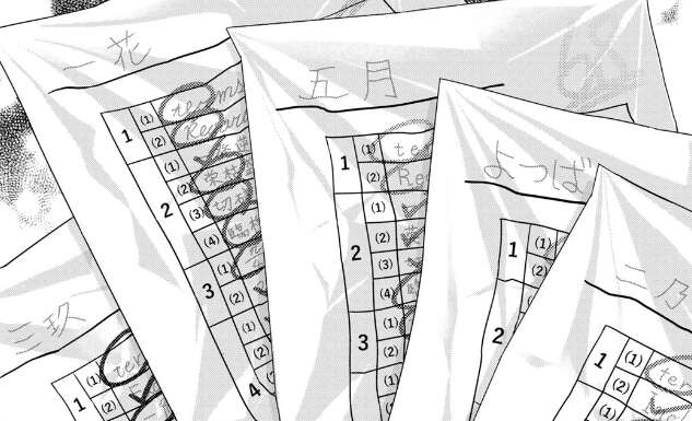 風太郎はらいはからの、お誕生日会の準備してまっているよというメッセージの着信音でやっと目を覚ましますが、そこには五羽の鶴が置いてあります。なにかの用紙で使っていることに気づいた風太郎は、その用紙を開いて五つ子たちの試験用紙だと分かります。