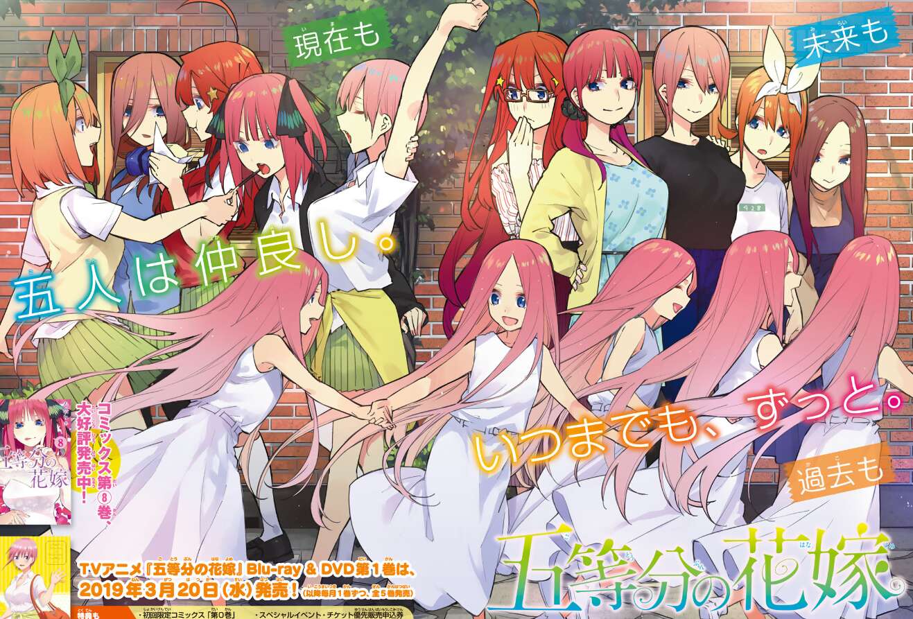 今週は巻頭カラーで、現在、過去、未来の五つ子が描かれています。