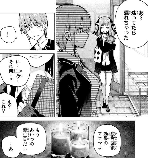 が、二乃も考えている事は同じで疲労回復効果のアロマを購入していて、風太郎の誕生日に送る予定です。二乃は一花からのメッセージは見ていましたが、あげたいものはあげたいと言います。