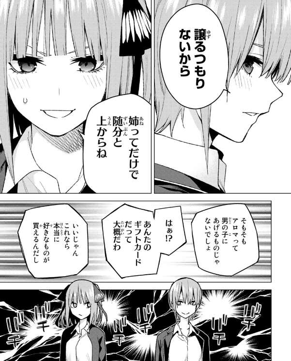 むしろ二乃は、私一人なら効果絶大だと言います。二乃の恋愛ブレーキの壊れっぷりに驚愕します。しかし二乃は一花も風太郎に誕生日プレゼントを用意している事を見抜き、一花に指摘します。指摘通り、一花も誕生日プレゼントを用意しておりギフトカードを用意していました。