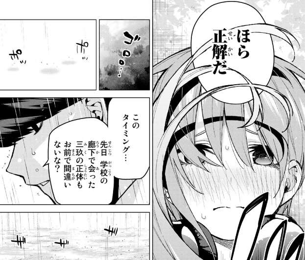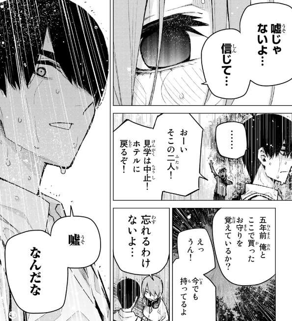 変装を暴かれてさらに、先日の学校の廊下で会った三玖に関しても紛争していたことを指摘され、もはや嘘をつき続けることも難しくなります。雨が降る中、五年前に会った零奈は、自分だと告白します。