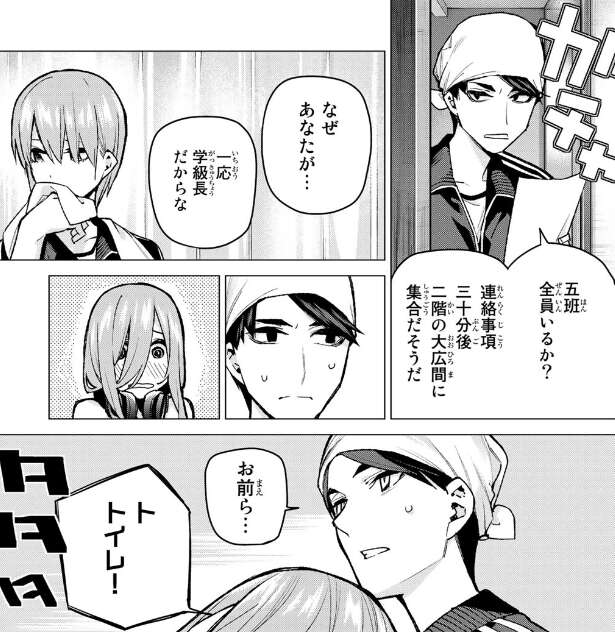 しかし、逆に三玖から謝られてしまう一花です。そこに風太郎が三十分後に、二階の大広間に集合するように連絡事項を伝えに来ます。三玖は風太郎の顔を見るとトイレに隠れてしまいます。五つ子たちの雰囲気から、揉めていることを察した風太郎は、話してみるように言います。