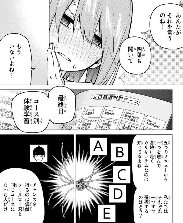 そして修学旅行最終日、二乃はAコース、四葉はBコース、五月はCコースを選択し、風太郎とは別のコースになってしまいます。