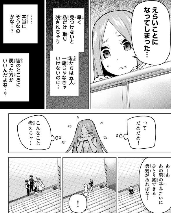 四葉は早く他の四人を見つけようとしますが、その一方で私たちは五人一緒じゃなきゃいけないという考え方に疑問も持っているようです。こんなこと考えてはいけないと自分に言い聞かせていると、第34話で盗撮騒動に巻き込まれている小学生時代の風太郎を見つけます。