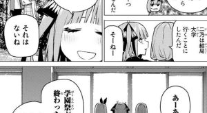 そして学園祭の準備ですが、屋台のメニュー決めからクラス内での対立に発展してしまい、二乃と三玖は何故か巻き込まれてしまいます。さらに二乃はクラスメイトの女子から恨まれてしまいますが、風太郎は自分が妄想している痛い奴だと思われてまで、二乃の誤解を解こうとします。結果的には信じてもらえてませんが、これで二乃がたこ焼き派の男子を狙っているという誤解は解けたんでしょうか?そしてこの件がきっかけとなり、父親へのわだかまりも少しはとけたのか、父親へ招待状を出すことを二乃は決めます。