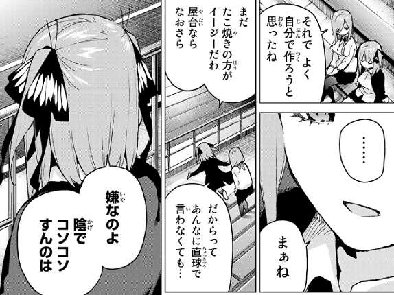 二乃もパンケーキが好きなようですが、最初にたこ焼きに一票を投票した手前、最後まで責任を持つと言い、男子組と一緒のたこ焼きに賛成しています。しかし二乃はかなりきつめの言い方で、女子組に言い返していますが、大丈夫でしょうか。思わぬクラス内での対立に困惑する風太郎と四葉ですが、そこに五月が何か相談したげな様子で近づいてきますが、結局学園祭を頑張りましょうと誤魔化して、相談はしません。