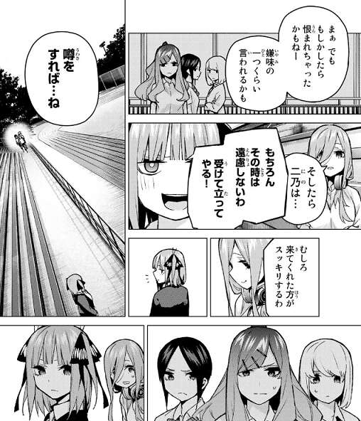 三玖から、女子組への言い方が直球過ぎると言われますが、二乃は陰でコソコソするのは嫌だと言い、もし嫌味の一つでも言われたらその時は遠慮しない、受けて立つと強気です。しかし噂をしているそばから、女子3人組が遠くから二乃の方を睨んでいて恨みを買ってしまっているようです。