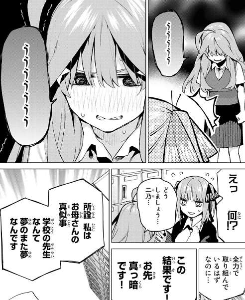思いつめた顔で変な声を漏らす五月に、心配して声をかける二乃ですが、どうやら入試判定が「D」でお先真っ暗、学校の先生なんて夢のまた夢と取り乱してしまったようです。取り乱す五月を、なんとか落ち着かせようと必死の二乃です。