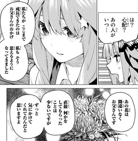 落ち着いた五月ですが、忙しそうな風太郎には申し訳ないと相談しておらず、先生からは一度、親と相談した方が良いと助言されています。二乃が相談できる親もいないかと父親の事を突き放すように言うと、五月はこれ以上父親に心配かけたくない、という意味だと言います。五月はここまで成長できたのはお父さんのおかげだと、最近はそう思えるようになってきたようで、墓参りの時の花も父親が備えてくれたものだと信じているようです。結局、入試判定の結果の相談は、五月が塾の先生にするという事で落ち着きます。