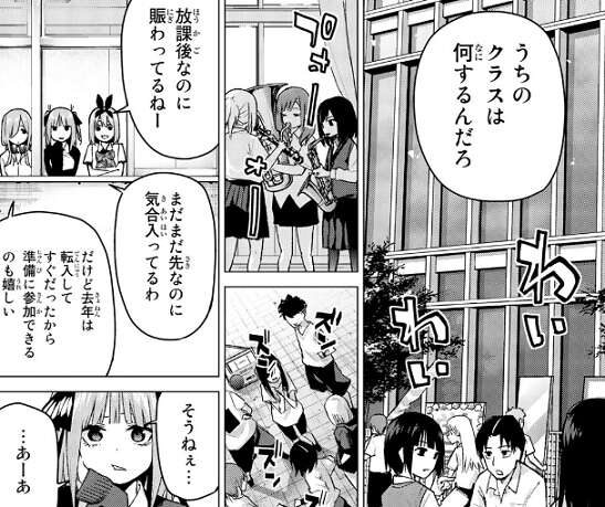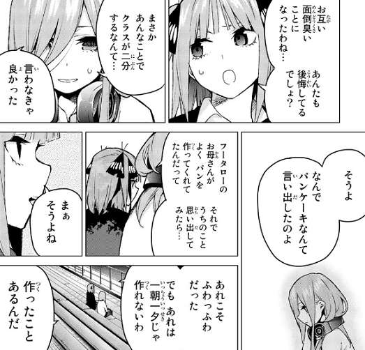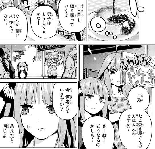 前回、学園祭に向けてクラスで屋台のメニューを話しあっていましたが、たこ焼きとパンケーキ、どちらがいいかで女子組、男子組で対立が起き、二乃と三玖は対立に巻き込まれてしまいます。学級長の風太郎はなかなかメニューが一つに絞れない状況に困っていますが、話し合いは平行線で決まりそうにありません。
