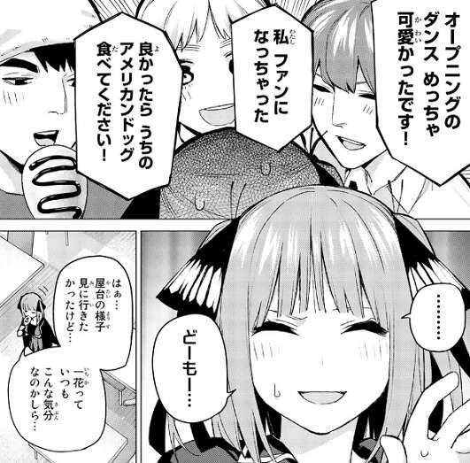 学園祭「日の出祭」がいよいよ始まり、二乃は女子生徒ユニットの一員として、オープニングでダンスを披露し注目を集めます。オープニングダンスが終わり、学園祭が開幕します。二乃はクラスのたこ焼き屋の屋台の様子を気にして声をかけようとしますが、オープニングダンスを見た男子に取り囲まれ四葉に話しかけることが出来ません。