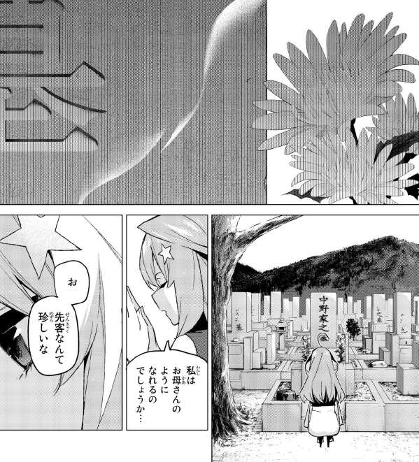 期末試験に向けての勉強を進めていましたが、日曜日に五月が不在で勉強が進められません。風太郎が怒っていると、二乃から今日は母親の月命日で墓参りをしていると告げられます。その頃、墓参りをしている五月ですが、五月は母親のようになれるか悩んでいます。
