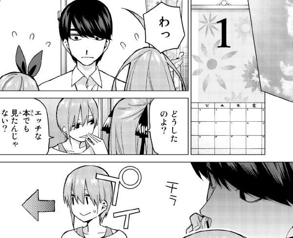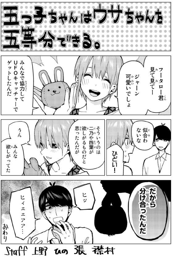 一花はUFOキャッチャーでゲットしたぬいぐるみを風太郎に見せますが、それは五つ子たちで分け合ったものででした。首の先を示された風太郎は、ドン引きです。