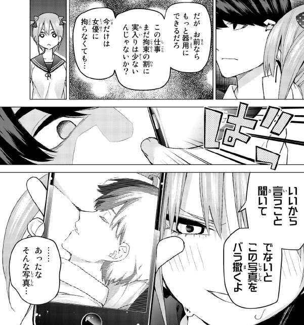 アルバイト先のお店に映画の撮影が来ます。興味のない風太郎は早々に立ち去ろうとしますが、そこに女優として一花が入っていきます。一花は風太郎に見られながら、映画の撮影を進みます。特に気にせず撮影が進んでいるようですが、一花は風太郎に演技を見られて内心恥ずかしくて仕方ありません。