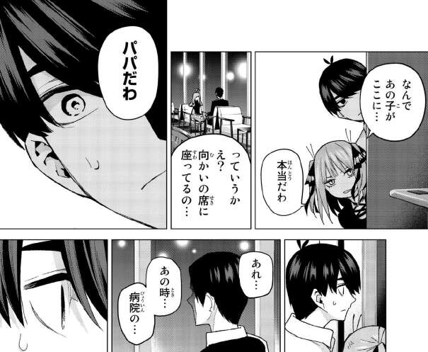 期末試験は無事終わり、全員赤点回避を出来ましたが二乃だけが期末試験後、どこかに行ってしまい風太郎は二乃を探しに出かけます。場面変わって、二乃は状況を報告すべく中野パパに直接会って話をします。今後も五つ子たち全員で頑張る事を伝えますが、中野パパに反対されますが、そこに風太郎が現れます。