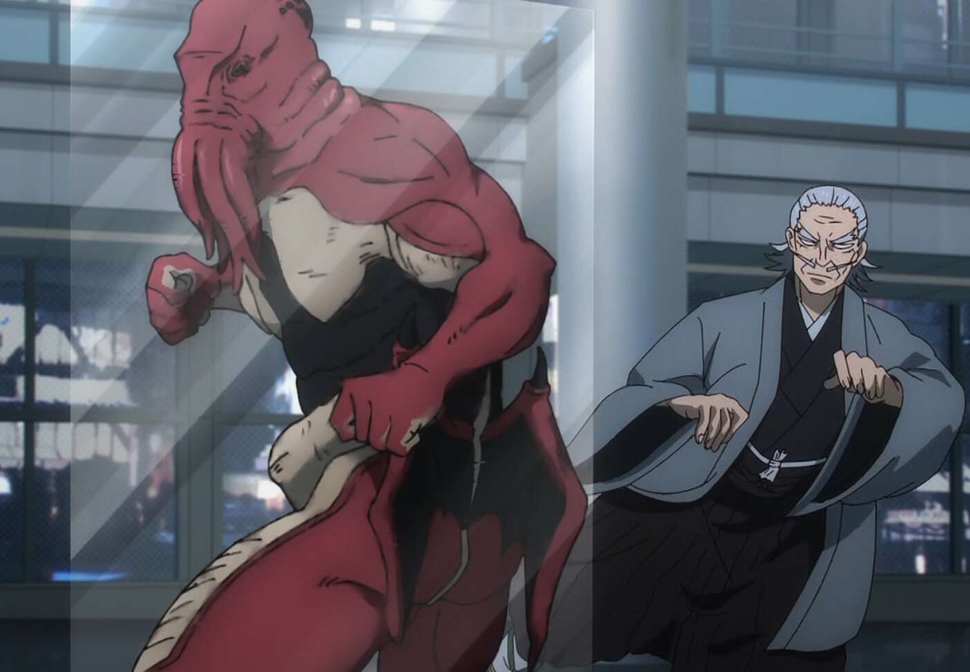 呪霊は陀艮と名乗り、漏瑚や真人と同様特級呪霊で、大量の水を生み出し操る術式を使い直毘人、七海、真希を押し流そうとします。陀艮の出した大量の水をかわした直毘人は、術式「投射呪法」で陀艮の速度を圧倒し、何度も攻撃しますが陀艮の果てしない体力を前にほとんど削ることが出来ません。それでも直毘人は「投射呪法」を使い、速度で圧倒し陀艮に術式を発動させる隙を与えません。