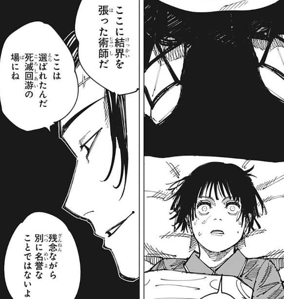 羂索は自分がここに結界を張った術師で、ここが死滅回游(ころしあい)の場に選ばれた事を佐々木に説明します。佐々木は事態を飲み込めずに、きょとんとしています。