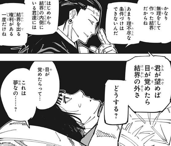 少し離れた所に刑場跡があり、そこが結界の中心で半径5.6キロだと、羂索は説明を続けます。そして、はじめから結界の内側にいる君達には結界を出る権利が一度だけある、と言い、佐々木が望めば目が覚めたら結界の外だと、羂索は言いどうするか佐々木に質問します。佐々木は、これは夢なの……?と、羂索に聞くと、夢と現実の間、呪(まじない)さ、と羂索は佐々木に答えます。